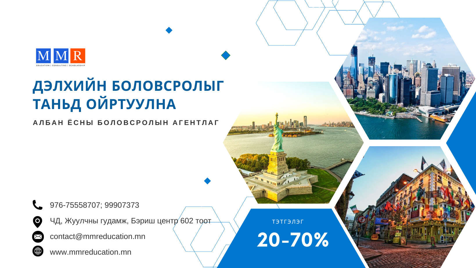 АНУ, Хятад, Чех, Канад, Сингапур, Энэтхэг зэрэг орны их дээд сургуульд хэлний бэлтгэл болон үндсэн ангид, Бакалавр, Магистрын хөтөлбөрт суралцах боломжтой